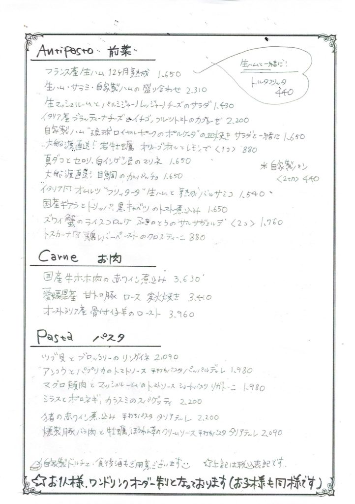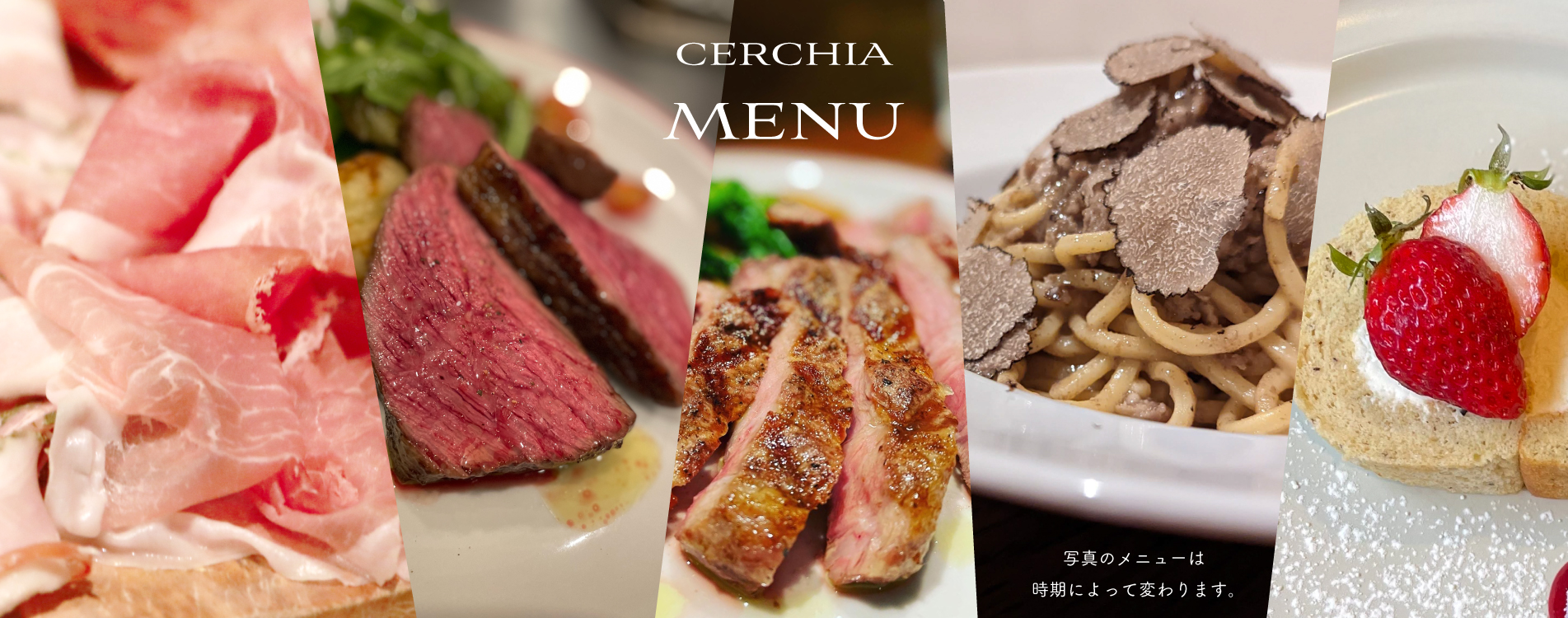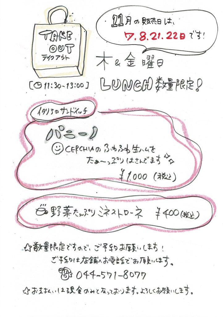 【ご来店予定のお客様へ】 お早めにご予約いただいた方がスムーズにご案内できます! お電話からお願いいたします。 14時~17時がつながりやすいです。営業ピークタイムはお電話をとれないことがございます。 何卒よろしくお願いいたします。 ご予約 044-571-8077 目次1 ランチ メニュー2 ディナー メニュー3 コース メニュー ランチ メニュー ランチタイムはこちらのメニューのみとなっております。アラカルトメニューはございません。あらかじめご了承ください。 2025.1213 ランチmenu-コピー ディナー メニュー -おうちでCERCHIA –平日テイクアウト ✦ 生ハムのご用意は、土・日・祝日もお承り致します。✦お気軽にお問い合わせください。 本日の前菜盛り合わせ4種(日によって変わります) 生ハム・サラミの盛り合わせ -おうちでCERCHIA –パニーノ 1月の販売予定 なし ボリューム満点!自家製フォカッチャ ふわふわ生ハム 自家製ハム ポルケッタ ゴロゴロ野菜たっぷりのミネストローネ オーダーごとにスライス ふわふわ生ハム 自家製ハム ポルケッタ 店内でもセットでご用意! コース メニュー ディナーパーティープラン20250925_0001-1 ご予約 044-571-8077
